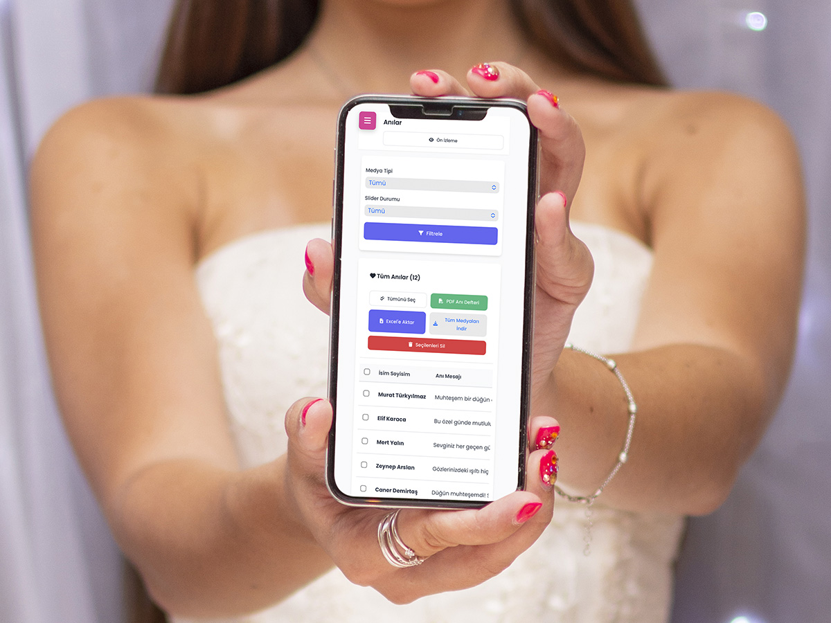 Tüm anıları panelinizden görüntüler, onaylar ve Excel/ZIP olarak tek tıkla indirebilirsiniz.